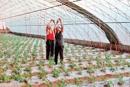 2月20日,忻府區(qū)“四季采摘園”大棚種植區(qū)的瓜農(nóng)正在為甜瓜吊蔓。