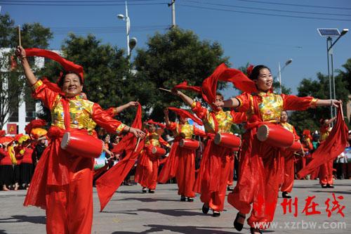圖為韓家樓鄉(xiāng)健身舞隊(duì)正在表演《健身腰鼓》