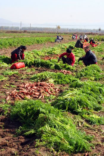 10月29日原平市小河村農(nóng)民正在收獲豐收的回茬胡蘿卜。他們根據(jù)市場(chǎng)需求,實(shí)施訂單和零售交叉種植,滿足不同客戶的需求,使冬儲(chǔ)菜成為土地增效農(nóng)民增收的品牌產(chǎn)品。(趙春曉 攝)