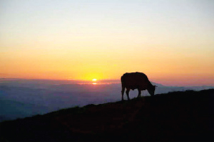南臺(tái)也被稱(chēng)為花臺(tái),各種野花競(jìng)相開(kāi)放,清新雅致。遠(yuǎn)眺峰巒疊嶂,漸入云端,近觀,地上完全鋪上了綠毯,牛馬自在地曬著太陽(yáng)吃著美味肥草。南臺(tái)景色優(yōu)美,但師傅們很清苦,夏天也身穿棉袍,因?yàn)樗聫R里比較陰冷。山上缺水,終年靠接雨水喝為生。我們坐著朋友的紅色越野車(chē)下山,擺出各種pose,留下了與綠地、藍(lán)天、白云、奶牛在一起的絕美畫(huà)面。