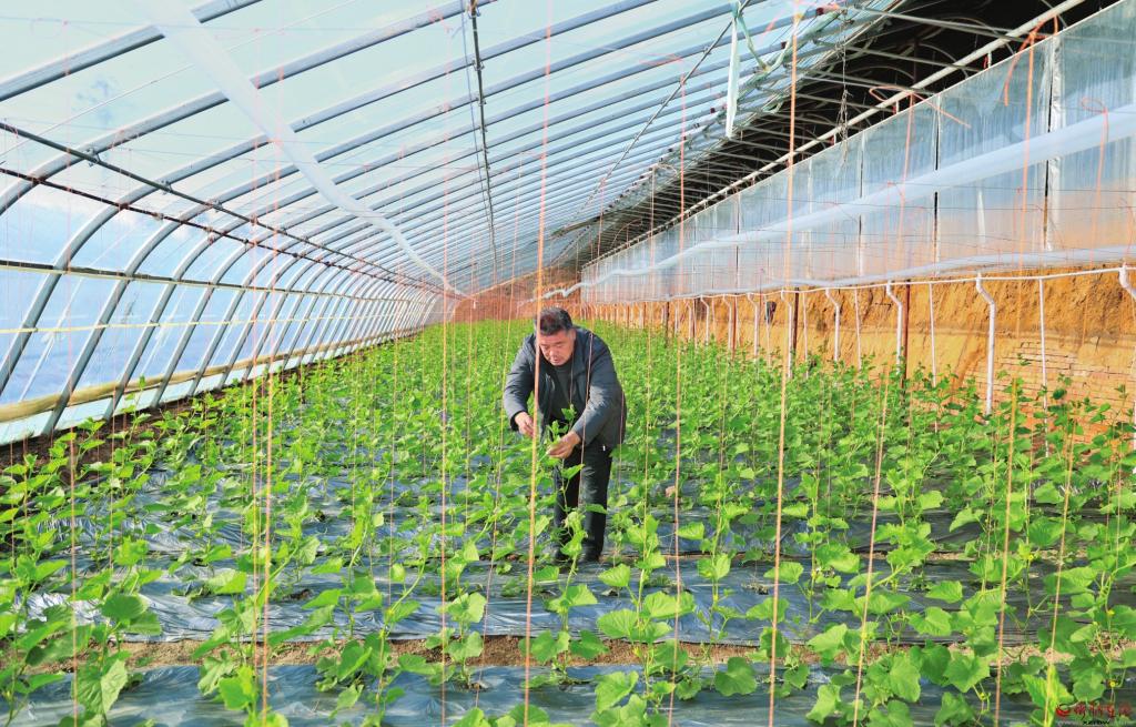 初冬時(shí)節(jié),室外溫度已到零下,原平市王家莊鄉(xiāng)弓家莊村蔬菜種植示范園區(qū)的溫室大棚內(nèi)卻溫暖如春,各種新鮮果蔬長(zhǎng)勢(shì)喜人。圖為村民正在對(duì)香瓜秧苗進(jìn)行管護(hù)。 本報(bào)記者 張存良攝