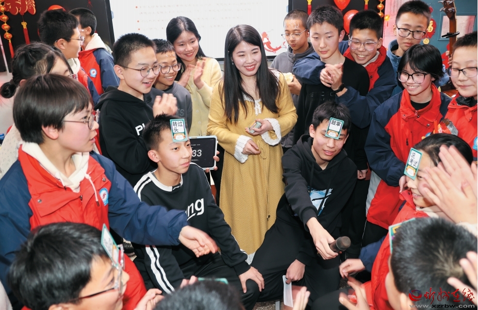 2024年12月30日,忻州師范學(xué)院附屬中學(xué)舉行班級元旦聯(lián)歡晚會,喜迎新年。圖為老師和孩子們一起做游戲。(記者 張存良攝)