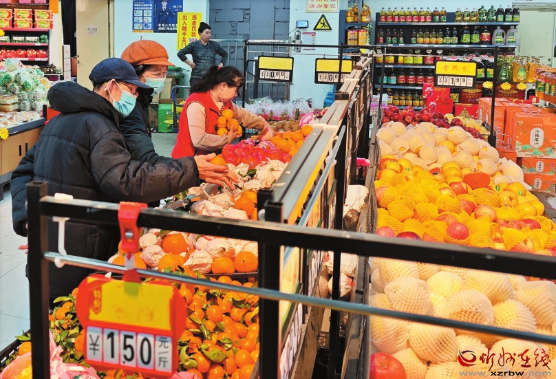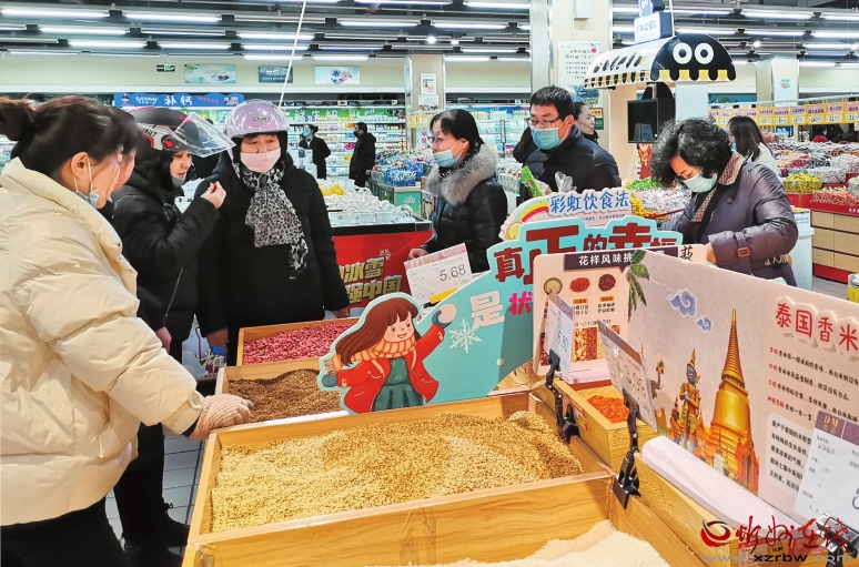 在家家利超市,記者看到,米面糧油、肉蛋奶、蔬菜水果、干果零食等各類商品琳瑯滿目,市民們推著購物車挑選著心儀的商品。超市還專門設(shè)置了禮品區(qū)、年貨區(qū),滿足市民走親訪友的需求,堅果、餅干、保健品等各式各樣的禮盒占據(jù)“C位”,吸引不少市民駐足選購。