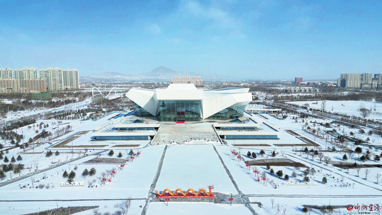 1月25日,忻州迎來2025年第一場雪。圖為忻州大劇院在皚皚白雪的掩映下分外壯美。(