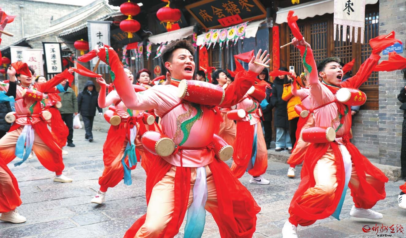 昨日,忻州各地歡天喜地鬧元宵。圖為忻州古城南北大街上的花鼓表演。 (