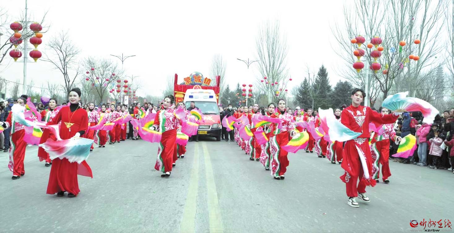 緊隨彩車的民俗方陣贏來陣陣喝彩:激昂鼓點中,舞獅靈動跳躍,眨眼、舔毛等動作活靈活現(xiàn),與翻騰的舞龍默契配合,共呈祥瑞之景;百人秧歌隊身著絳紅綢衣,手持牡丹花傘踏出“九連環(huán)”陣型;“五路財神”向四方賓朋招財納福,引得青年群體爭相與“眾財神”合影;“花轎毛驢”表演中,花轎紅綢飛揚,毛驢馱著俏皮“媒婆”,鈴鐺聲與歡笑聲交織;雙扇舞中百名手持雙扇、身著一抹綠裙的舞者翩翩起舞,跳出濃濃的傳統(tǒng)韻味;彩車周圍人頭攢動,熱情洋溢的表演者接連送上不同歌舞,期間“猜燈謎”“搖一搖抽獎”等活動不斷將現(xiàn)場氣氛推向高潮。本報通訊員
