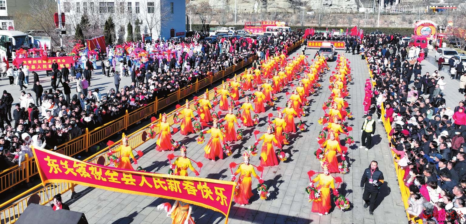 2月22日,縣城同舟廣場(chǎng)成為這場(chǎng)文化盛宴的中心舞臺(tái)。14支特色方陣、兩千余名參演者齊聚一堂,為全縣人民獻(xiàn)上了一場(chǎng)融合非遺精粹、民俗風(fēng)情與時(shí)代新韻的文化大餐。上午9時(shí),義門鎮(zhèn)的威風(fēng)鑼鼓隊(duì)率先擂響春雷般的鼓點(diǎn),拉開展演序幕。隨后,保德大秧歌、黃河旱船、安塞腰鼓等節(jié)目輪番登場(chǎng)。金色巨龍騰空翻躍,舞獅表演靈動(dòng)威猛,秧歌隊(duì)伍歡快喜慶,將黃土地上的蓬勃生機(jī)展現(xiàn)得淋漓盡致。除了傳統(tǒng)民俗表演,教師方陣、軍樂(lè)隊(duì)、夕陽(yáng)紅文藝宣傳隊(duì)等也紛紛登場(chǎng),精彩的表演詮釋著保德人民對(duì)美好生活的追求。