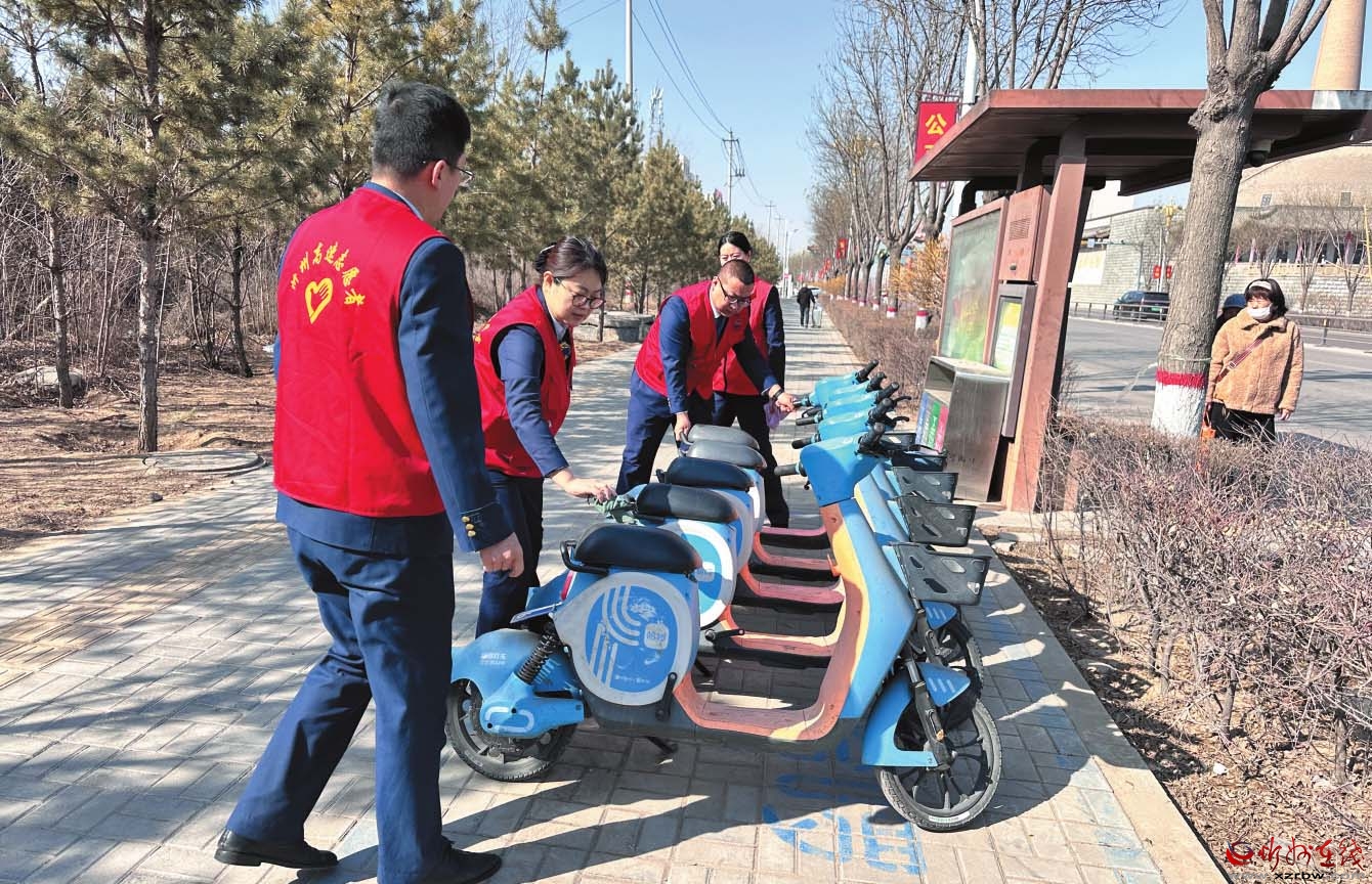 3月5日,山西交控忻州公司河曲收費(fèi)站的工作人員身著紅馬甲化身志愿者,在街頭認(rèn)真整理共享單車,細(xì)致清掃路邊垃圾,精心擦拭公共設(shè)施,他們用行動(dòng)讓雷鋒精神在新時(shí)代熠熠生輝。(劉冬梅 劉曉榮攝影報(bào)道)