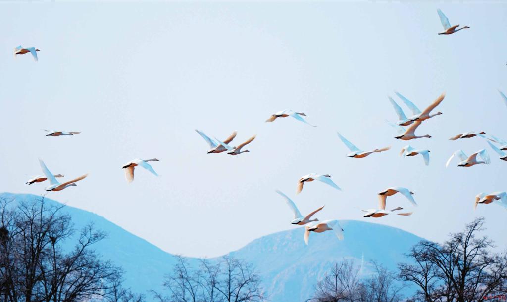 在忻府區(qū)永豐莊,成群結(jié)隊(duì)的天鵝舒展著潔白的羽翼在天空翱翔,或引吭高歌,或盤(pán)旋飛舞,與周?chē)奶镆啊⑺{(lán)天構(gòu)成了一幅和諧而靈動(dòng)的唯美畫(huà)卷。 (張 鵬攝
