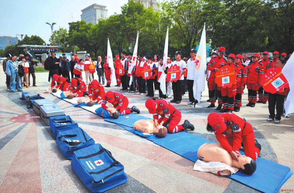 5月8日,忻州市紅十字會在忻州城區(qū)體育廣場舉行紀念“5·8世界紅十字日”暨“紅十字博愛周”宣傳活動。圖為救援隊員進行救護演練。(