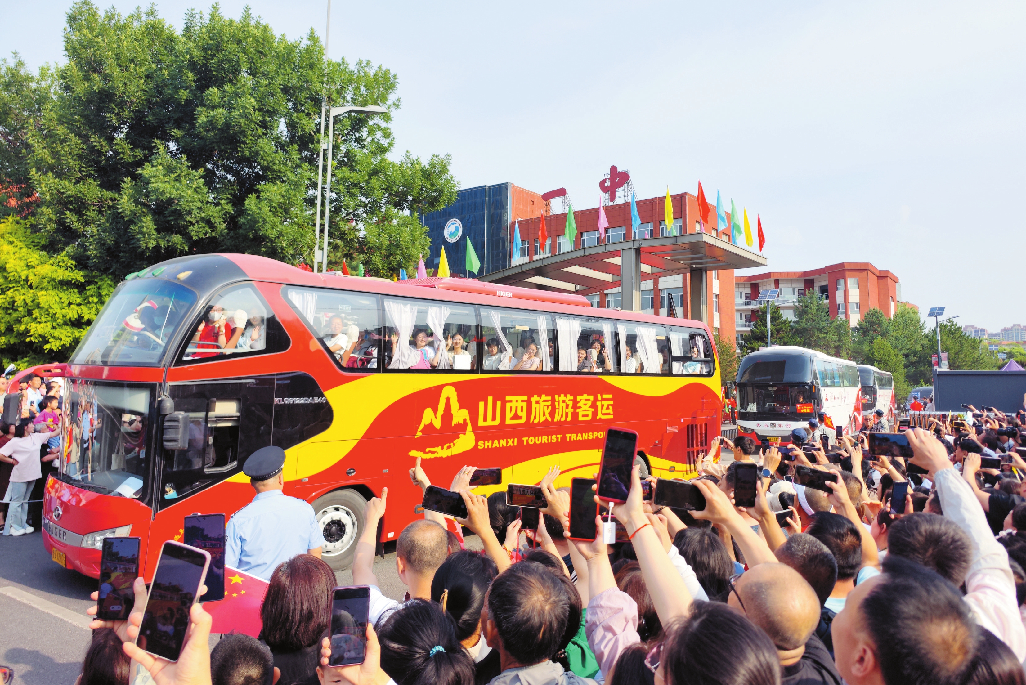 圖為忻州一中考點(diǎn),家長(zhǎng)歡送考車(chē)駛出校門(mén)。張存良攝