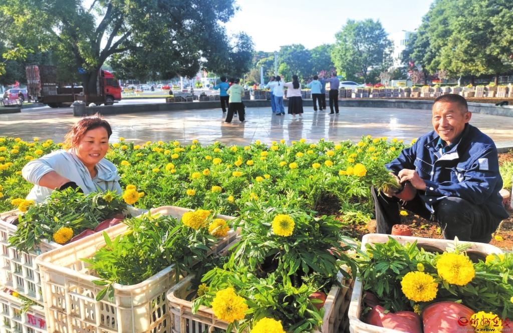 9月9日,山西云中園林工程有限公司人員在忻州城區(qū)日月廣場更換萬壽菊,讓“日月同輝”主題花壇為城區(qū)添彩,喜迎國慶。 (