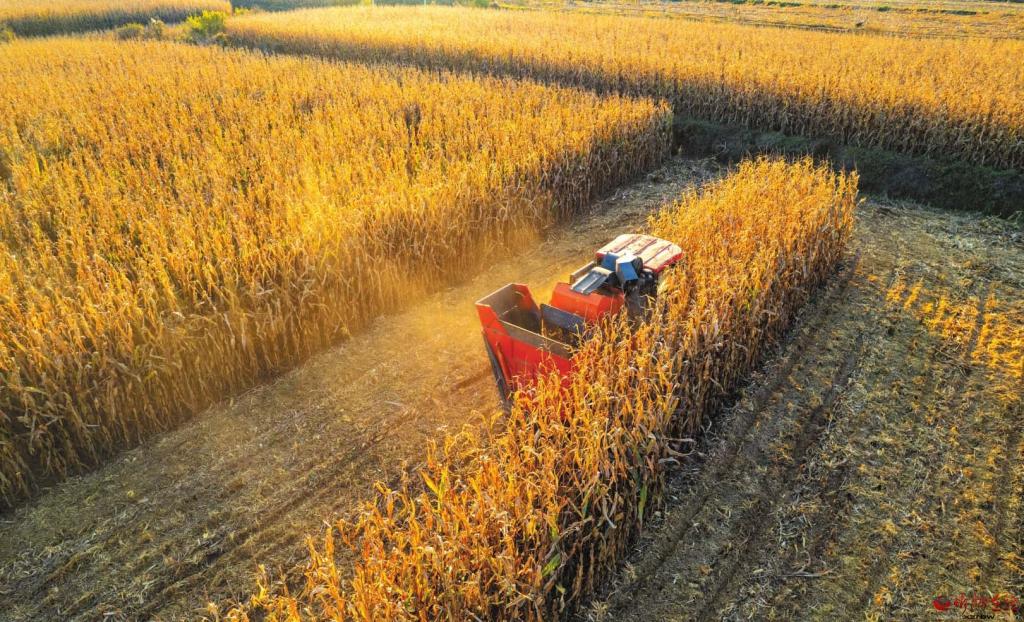 近日,原平市崞陽(yáng)鎮(zhèn)下韓村村民正在緊張有序地?fù)屖沼衩?,確保秋糧顆粒歸倉(cāng)。 (
