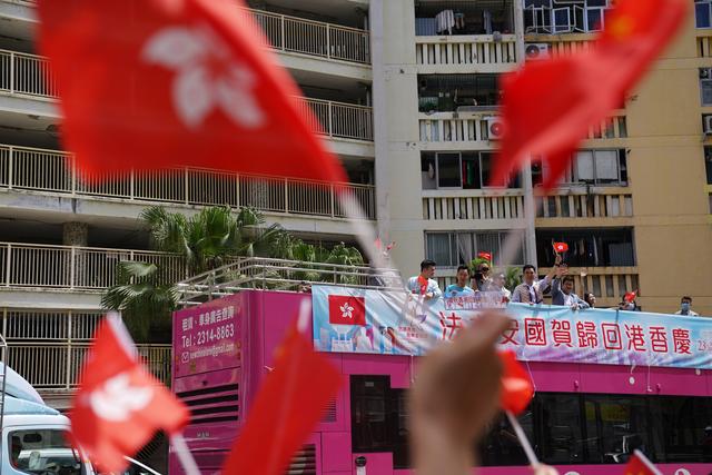 7月1日,市民揮舞國(guó)旗、區(qū)旗和巡游巴士互動(dòng)。新華社記者王申 攝