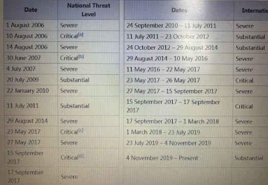 2005年,英國發(fā)生了震驚中外的倫敦地鐵恐襲爆炸案,共造成56人死亡(包括4名恐怖分子)。2006年8月1日起,英國警方開始公開發(fā)布國家安全風(fēng)險預(yù)警,從低到高,一共有5個等級。