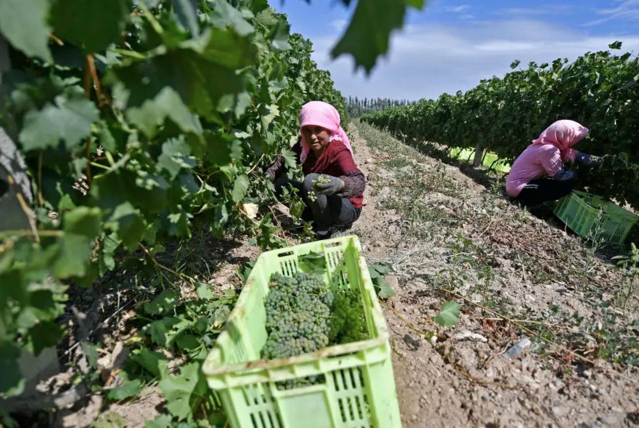 △寧夏銀川市永寧縣閩寧鎮(zhèn)原隆村立蘭釀酒葡萄種植基地,農戶在田間采摘葡萄。