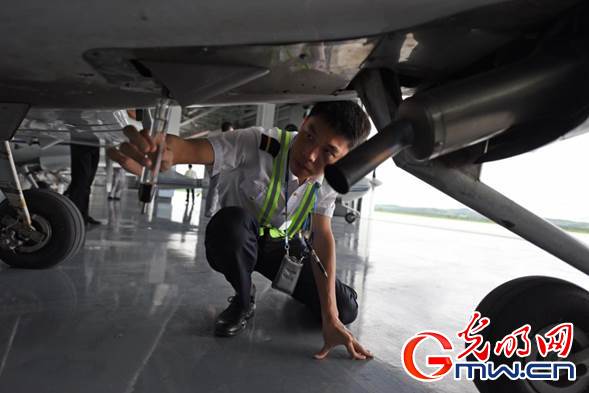 訓(xùn)練機(jī)起飛前,飛行學(xué)員們正在檢查機(jī)身狀況。光明網(wǎng)記者 潘迪攝