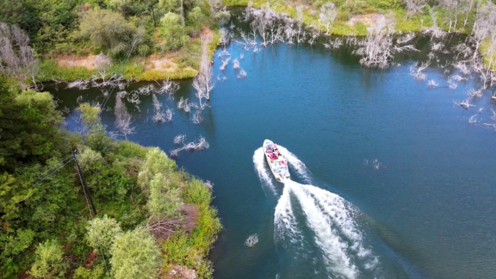 8月21日拍攝的北京市密云水庫綜合執(zhí)法大隊(duì)水上分隊(duì)隊(duì)員執(zhí)行任務(wù)(無人機(jī)拍攝)(記者夏子麟攝)