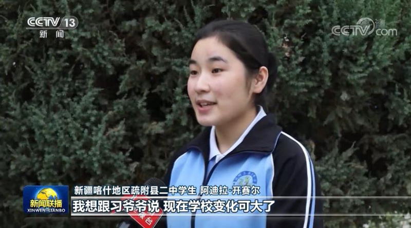 從設(shè)施到扶貧,從醫(yī)療到教育,發(fā)生在新疆的變化各族人民感同身受。疏附縣二中學(xué)生阿迪拉告訴記者,2014年4月,習(xí)近平總書(shū)記來(lái)學(xué)??赐麕熒€跟大家合了影。站在總書(shū)記右手邊的就是阿迪拉,現(xiàn)在她已經(jīng)是一名高中生了。