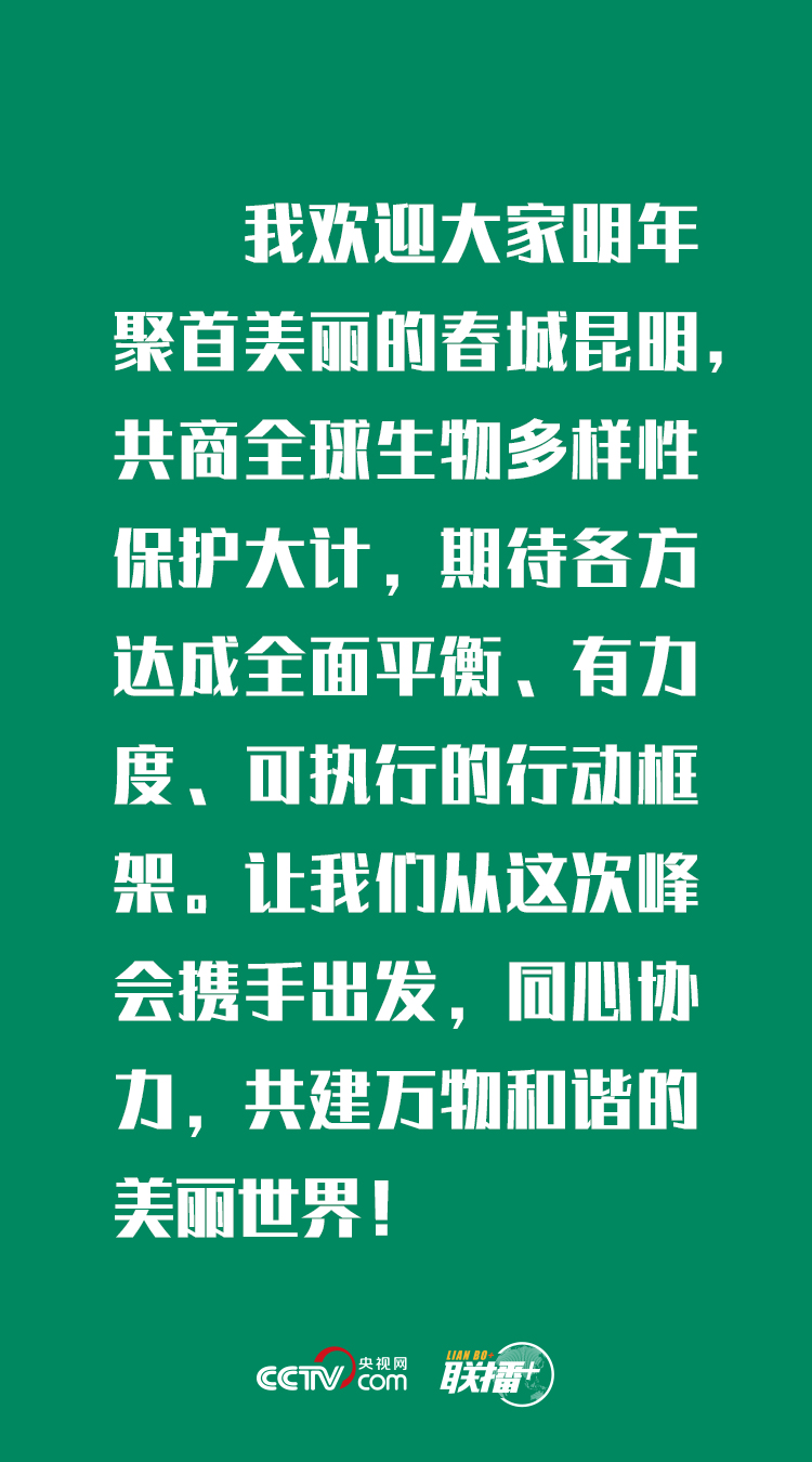 聯(lián)播+9月30日,聯(lián)合國舉辦生物多樣性峰會,國家主席習近平在峰會上通過視頻發(fā)表重要講話。 “在聯(lián)合國成立75周年之際,在各國致力于抗擊新冠肺炎疫情、推動經(jīng)濟高質(zhì)量復蘇這一特殊時刻,聯(lián)合國舉辦生物多樣性峰會,大家共同探討保護生物多樣性、促進可持續(xù)發(fā)展的重大課題,具有現(xiàn)實而深遠的意義。” 峰會上,習近平主席結(jié)合全球生物多樣性現(xiàn)狀,就共建萬物和諧的美麗家園提出“中國倡議”,并同各方分享了中國的生物多樣性治理和生態(tài)文明建設經(jīng)驗,向世界發(fā)出“春城之邀”。 央視網(wǎng)《聯(lián)播+》特梳理習近平主席此次講話內(nèi)容,與您一起學習。 提出四點倡議 “當前,全球物種滅絕速度不斷加快,生物多樣性喪失和生態(tài)系統(tǒng)退化對人類生存和發(fā)展構(gòu)成重大風險。新冠肺炎疫情告訴我們,人與自然是命運共同體。我們要同心協(xié)力,抓緊行動,在發(fā)展中保護,在保護中發(fā)展,共建萬物和諧的美麗家園?!绷暯街飨h: ●堅持生態(tài)文明,增強建設美麗世界動力 我們要站在對人類文明負責的高度,尊重自然、順應自然、保護自然,探索人與自然和諧共生之路,促進經(jīng)濟發(fā)展與生態(tài)保護協(xié)調(diào)統(tǒng)一,共建繁榮、清潔、美麗的世界。 ●堅持多邊主義,凝聚全球環(huán)境治理合力 我們要堅定捍衛(wèi)以聯(lián)合國為核心的國際體系,維護國際規(guī)則尊嚴和權(quán)威,提升全球環(huán)境治理水平。 ●保持綠色發(fā)展,培育疫后經(jīng)濟高質(zhì)量復蘇活力 我們要著眼長遠,保持定力,堅持綠色、包容、可持續(xù)發(fā)展。 我們要以自然之道,養(yǎng)萬物之生,從保護自然中尋找發(fā)展機遇,實現(xiàn)生態(tài)環(huán)境保護和經(jīng)濟高質(zhì)量發(fā)展雙贏。 ●增強責任心,提升應對環(huán)境挑戰(zhàn)行動力 我們要堅持共同但有區(qū)別的責任原則,堅持公平公正惠益分享,照顧發(fā)展中國家資金、技術(shù)、能力建設方面的關(guān)切。 我們要切實踐行承諾,抓好目標落實,有效扭轉(zhuǎn)生物多樣性喪失,共同守護地球家園。 分享三大經(jīng)驗 此次峰會上,習近平主席還同各方分享了中國的生物多樣性治理和生態(tài)文明建設經(jīng)驗: ●中國用生態(tài)文明理念指導發(fā)展 中國把生態(tài)文明建設放在突出地位,融入中國經(jīng)濟社會發(fā)展各方面和全過程,努力建設人與自然和諧共生的現(xiàn)代化。 ●中國采取有力政策行動 中國堅持山水林田湖草生命共同體,協(xié)同推進生物多樣性治理。加快國家生物多樣性保護立法步伐,劃定生態(tài)保護紅線,建立國家公園體系,實施生物多樣性保護重大工程,提高社會參與和公眾意識。 ●中國積極參與全球環(huán)境治理 中國切實履行氣候變化、生物多樣性等環(huán)境相關(guān)條約義務,已提前完成2020年應對氣候變化和設立自然保護區(qū)相關(guān)目標。 “作為世界上最大發(fā)展中國家,我們也愿承擔與中國發(fā)展水平相稱的國際責任,為全球環(huán)境治理貢獻力量。”習近平主席表示,“中國將秉持人類命運共同體理念,繼續(xù)作出艱苦卓絕努力,提高國家自主貢獻力度,采取更加有力的政策和措施,二氧化碳排放力爭于2030年前達到峰值,努力爭取2060年前實現(xiàn)碳中和,為實現(xiàn)應對氣候變化《巴黎協(xié)定》確定的目標作出更大努力和貢獻。” 發(fā)出一個邀請 峰會上,習近平主席向大家介紹,“中國將于明年在昆明舉辦《生物多樣性公約》第十五次締約方大會”,并邀請大家明年聚首春城昆明,共商全球生物多樣性保護大計。