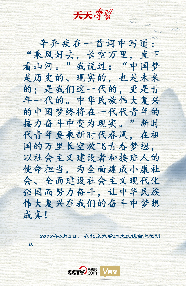 天天學(xué)習(xí) 新中國(guó)成立71周年又適逢中秋佳節(jié),14億中國(guó)人民沉浸在喜樂祥和的節(jié)日氛圍里,家國(guó)情懷在這一刻氤氳升華。 八百多年前的一個(gè)中秋之夜,愛國(guó)詞人辛棄疾對(duì)著朗朗明月吟出“乘風(fēng)好去,長(zhǎng)空萬里,直下看山河”。詞人夢(mèng)想自己成為展翅飛翔的大鵬鳥,乘風(fēng)直上萬里長(zhǎng)空,盡情俯瞰祖國(guó)的大好山河。 2018年5月2日,在北京大學(xué)師生座談會(huì)上,習(xí)近平總書記引用了辛棄疾這句意境宏闊的中秋詞句,號(hào)召新時(shí)代青年要乘新時(shí)代春風(fēng),在祖國(guó)的萬里長(zhǎng)空放飛青春夢(mèng)想。
