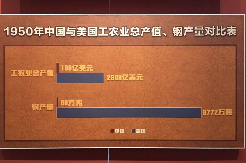 1950年,新中國的工農(nóng)業(yè)總產(chǎn)值僅為美國的1/28,鋼產(chǎn)量還不到美國的1/114。在武器裝備上,兩支軍隊更是天壤之別。