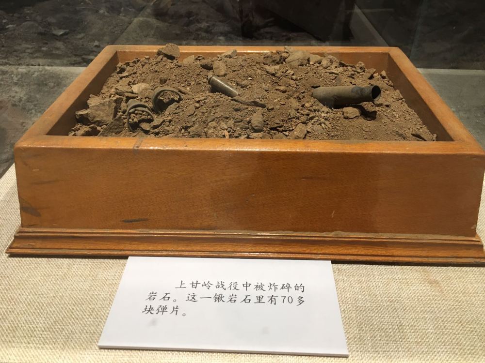 在軍博的主題展覽“血戰(zhàn)上甘嶺”展區(qū),幾件戰(zhàn)場實物似乎還能讓人聞到當(dāng)年的殘酷硝煙:一截嵌滿彈片的枯樹干,一堆摻雜著彈片的碎石焦土,被炸斷50多處的200多米電話線……