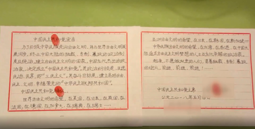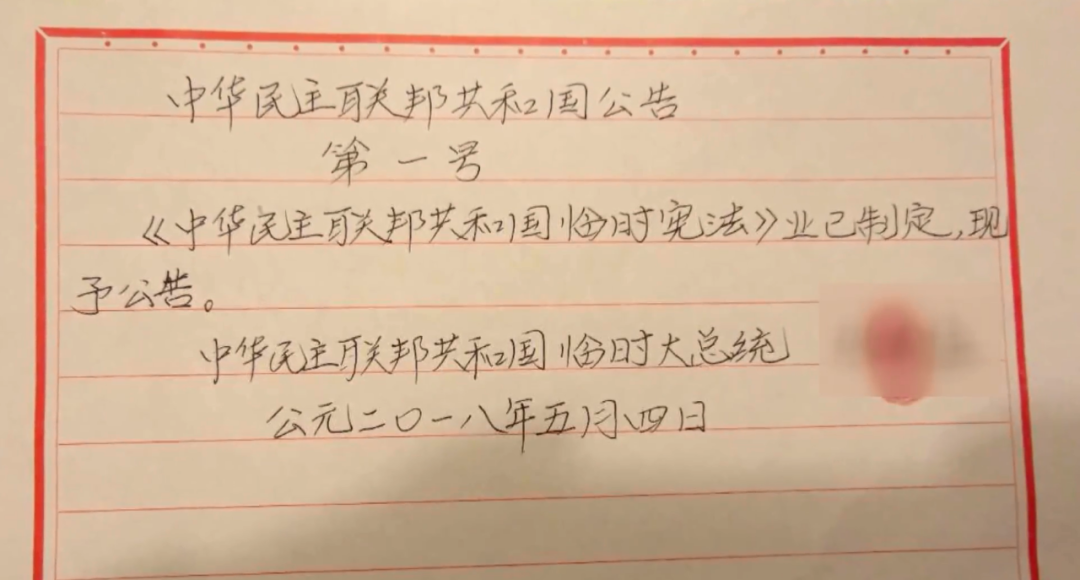 在境外落腳的酒店內(nèi),張某起草了他所謂的“建國綱領(lǐng)”和“建黨綱領(lǐng)”,隨后,在酒店房間內(nèi)舉行儀式,宣布成立“中國民主共和黨”和“中華民主聯(lián)邦共和國”,并宣誓出任“大總統(tǒng)”,頒布“總統(tǒng)一號令”。