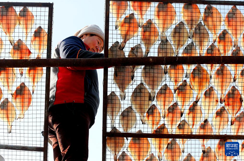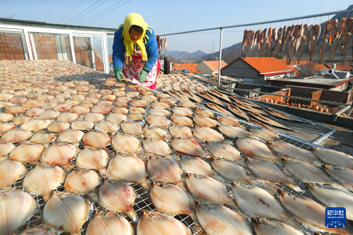 1月13日,山東省青島市即墨區(qū)鰲山衛(wèi)街道垛石村的漁民在晾曬魚干。(新華社發(fā) 梁孝鵬 攝)