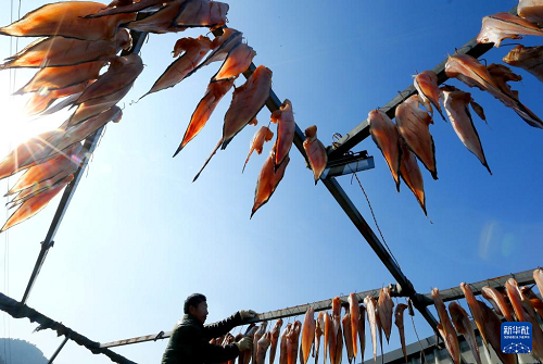 春節(jié)臨近,山東省青島市即墨區(qū)沿海一帶的漁民抓住晴好天氣,將捕獲的海魚進(jìn)行切割、腌制、晾曬,加工成魚干,供應(yīng)節(jié)日市場。
