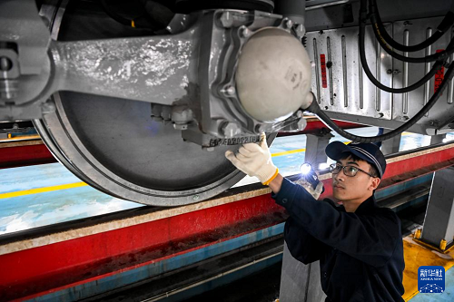 1月14日,在中國(guó)鐵路南寧局集團(tuán)有限公司南寧車輛段南寧動(dòng)車所,地勤機(jī)械師對(duì)動(dòng)車走行部進(jìn)行檢查。(新華社記者 曹祎銘 攝)