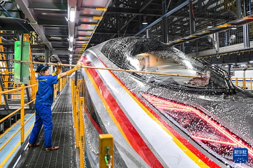 1月14日,在中國(guó)鐵路南寧局集團(tuán)有限公司南寧車輛段南寧動(dòng)車所,工作人員對(duì)車體表面進(jìn)行清潔。(新華社記者 曹祎銘 攝)
