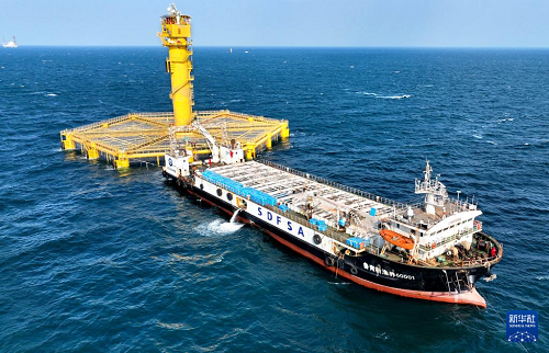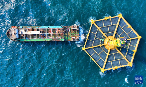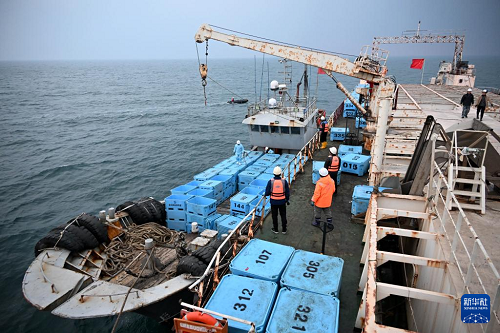 養(yǎng)殖工船在進(jìn)行儲(chǔ)魚(yú)箱吊轉(zhuǎn)作業(yè)(1月12日攝)。(新華社記者 李紫恒 攝)