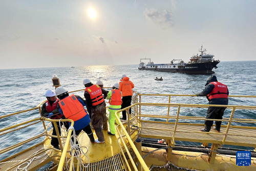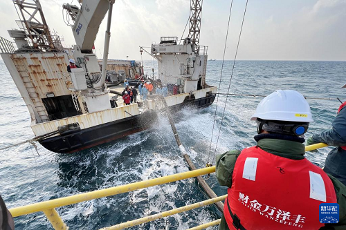 工人在“深藍(lán)2號(hào)”上進(jìn)行拉網(wǎng)作業(yè)(1月12日攝)。(新華社記者 李紫恒 攝)
