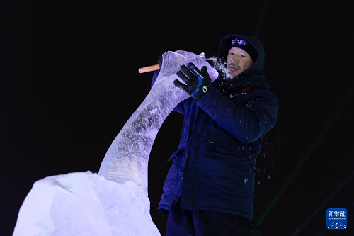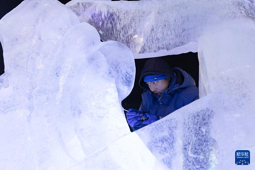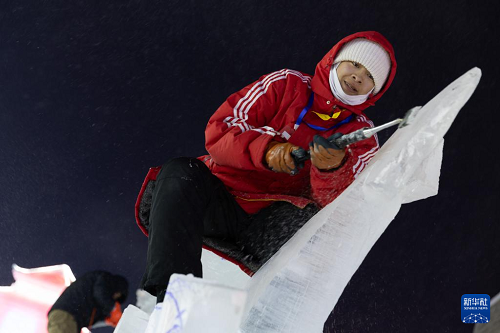 1月15日,參賽選手在哈爾濱冰雪大世界園區(qū)進(jìn)行冰雕創(chuàng)作。(新華社記者 張濤 攝)