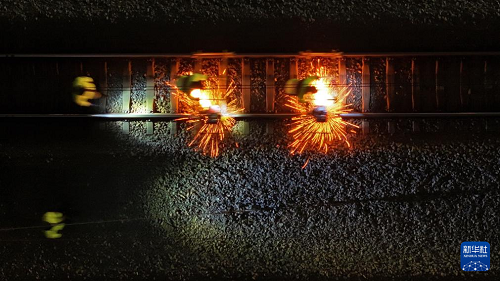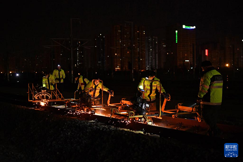 1月16日凌晨,長沙高鐵工務(wù)段線路工在長沙南站滬昆場打磨鋼軌。(新華社記者 陳振海 攝)
