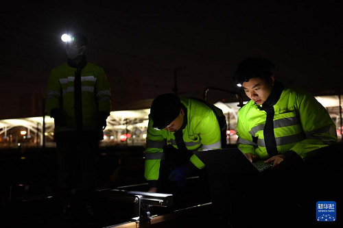 1月16日凌晨,長沙高鐵工務(wù)段線路工在長沙南站滬昆場作業(yè)前測量鋼軌廓形。(新華社記者 陳振海 攝)