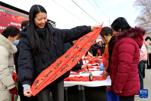 1月21日,在甘肅省平?jīng)鍪徐o寧縣原安鎮(zhèn)齊埂村舉行的靜寧縣文化科技衛(wèi)生“三下鄉(xiāng)”集中示范活動(dòng)現(xiàn)場(chǎng),村民喜領(lǐng)志愿者書寫的春聯(lián)。(新華社發(fā) 王毅 攝)