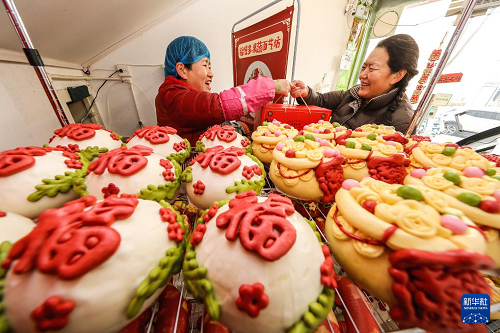 1月22日,顧客在河南省商丘市睢陽(yáng)區(qū)一家花饃店購(gòu)買(mǎi)花饃。(新華社發(fā) 李恒 攝)