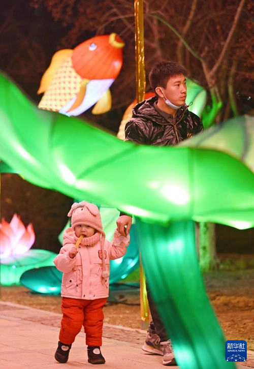 1月22日,家長帶著小朋友在第二屆津彩大燈會游覽。(新華社記者 李然 攝)