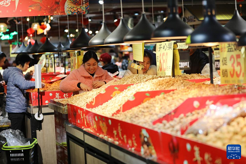 1月25日,人們在湖南永州道縣一家超市選購年貨。(新華社發(fā) 何紅福 攝)