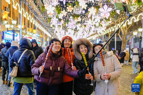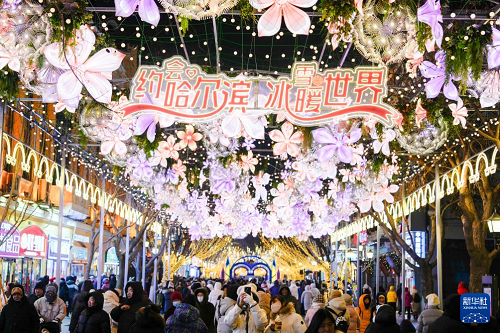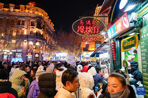 1月30日,游客在哈爾濱中央大街上游玩、拍照。(新華社記者 王建威 攝)