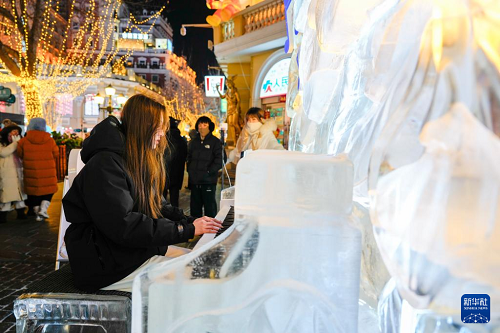 1月30日,游客在哈爾濱中央大街上彈奏冰鋼琴。(新華社記者 王建威 攝)