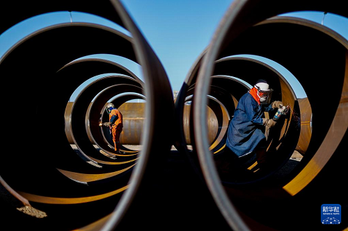 2月5日,江蘇省連云港經(jīng)濟(jì)技術(shù)開發(fā)區(qū)一家風(fēng)力設(shè)備公司工人在車間內(nèi)生產(chǎn)風(fēng)電塔架。(新華社發(fā) 王健民 攝)