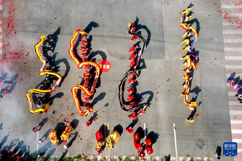 2月6日,人們在南澗縣龍燈會上表演舞龍(無人機照片)。(新華社發(fā) 適志宏 攝)