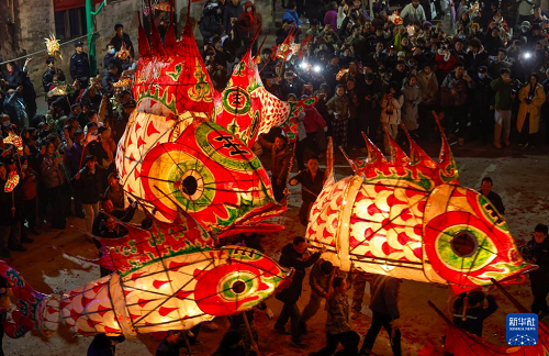 2月10日晚,村民在安徽省黃山市歙縣溪頭鎮(zhèn)汪滿田村嬉魚燈。(新華社發(fā) 施亞磊 攝)