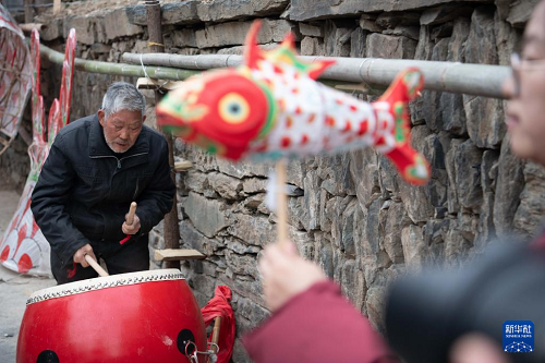 2月10日,在安徽省黃山市歙縣溪頭鎮(zhèn)汪滿田村,村民在嬉魚燈前練習打鼓。(新華社記者 張端 攝)