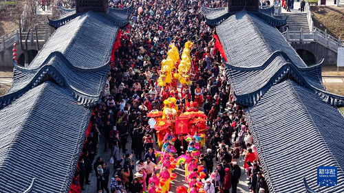 2月13日,民俗文藝表演隊從全椒縣太平橋上經(jīng)過(無人機照片)。(新華社發(fā) 劉玉才 攝)