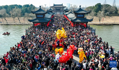 2月13日是農(nóng)歷正月十六,安徽省滁州市全椒縣傳統(tǒng)民俗活動“走太平”拉開帷幕。巡游隊伍穿過太平橋,獻(xiàn)上精彩紛呈的民俗表演。