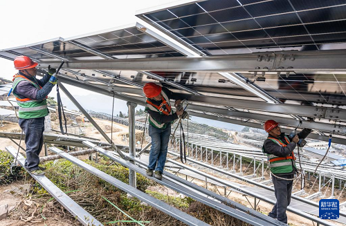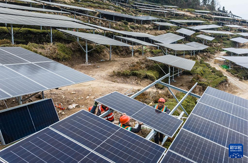 2月13日,技術(shù)人員在湖北省宜昌市秭歸縣茅坪鎮(zhèn)四溪村光伏電站建設(shè)現(xiàn)場安裝光伏板。(新華社發(fā) 鄭家裕 攝)